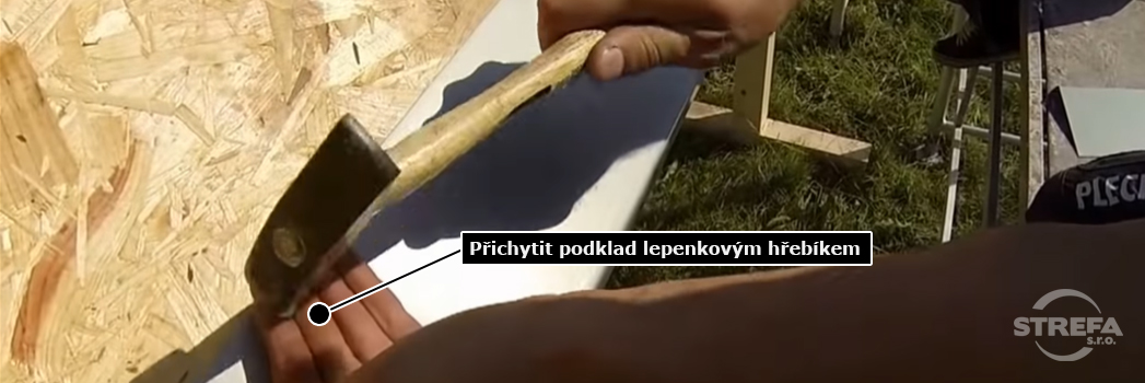 | Wir befestigen den Traufblech alle 20 cm mit Pappnägeln und einem Hammer an der Innenkante. Das Material der Nägel ( CU, FeZn und AL ) wählen wir immer entsprechend dem bei der Blechherstellung verwendeten Material. Der Untergrund muss nicht vorgebohrt werden, der Pappnagel geht durch das Material. |